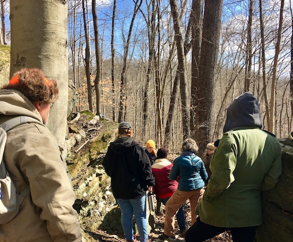 At least 45 cheerful hikers joined our volunteer guides for several treks through the beautiful winter woods, with a blue sky above and just a little mud underfoot. Many thanks go to our volunteers, trail guides, fire-builder, sign-hanger, and raffle-prize donor Cabela’s.