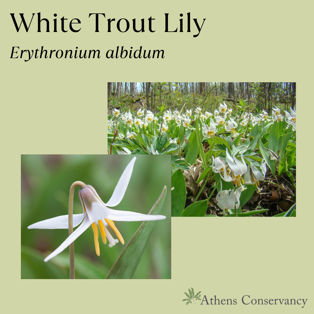White Trout Lily (Erythronium albidum) blooms as a single flower per stem and sports six white petals that curve backwards. The plant can grow up to 6 inches tall.