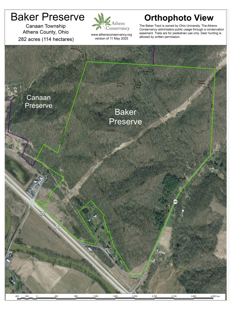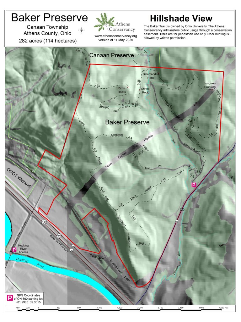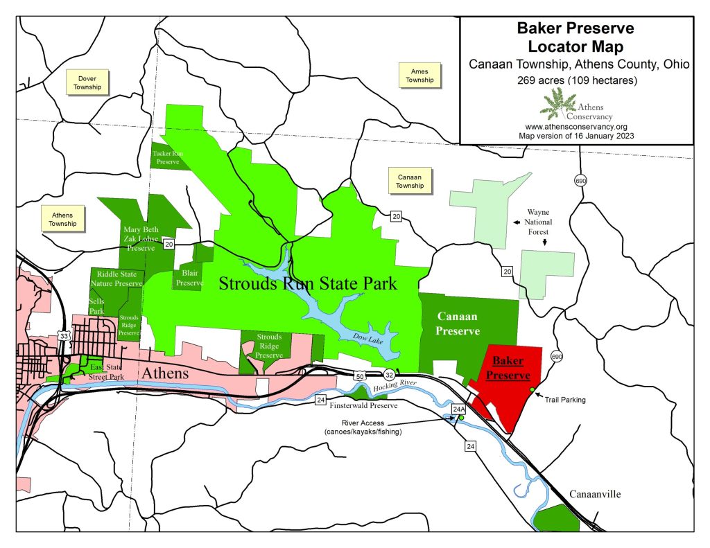 The 282-acre Baker Preserve, previously owned by the family of Dr. John Calhoun Baker, former president of Ohio University, was donated to the university in 2023. It is managed as a nature preserve under a conservation easement held by Athens Conservancy. The preserve is located near the intersection of US-50 and OH-690 and includes frontage on the Hocking River. The Hocking River Commission has a river recreational access point on the property along County Road 24A (South Canaan Road), under an agreement with the Conservancy.