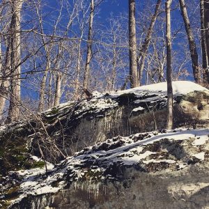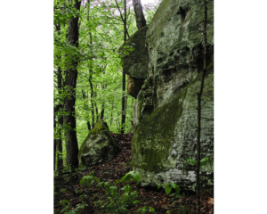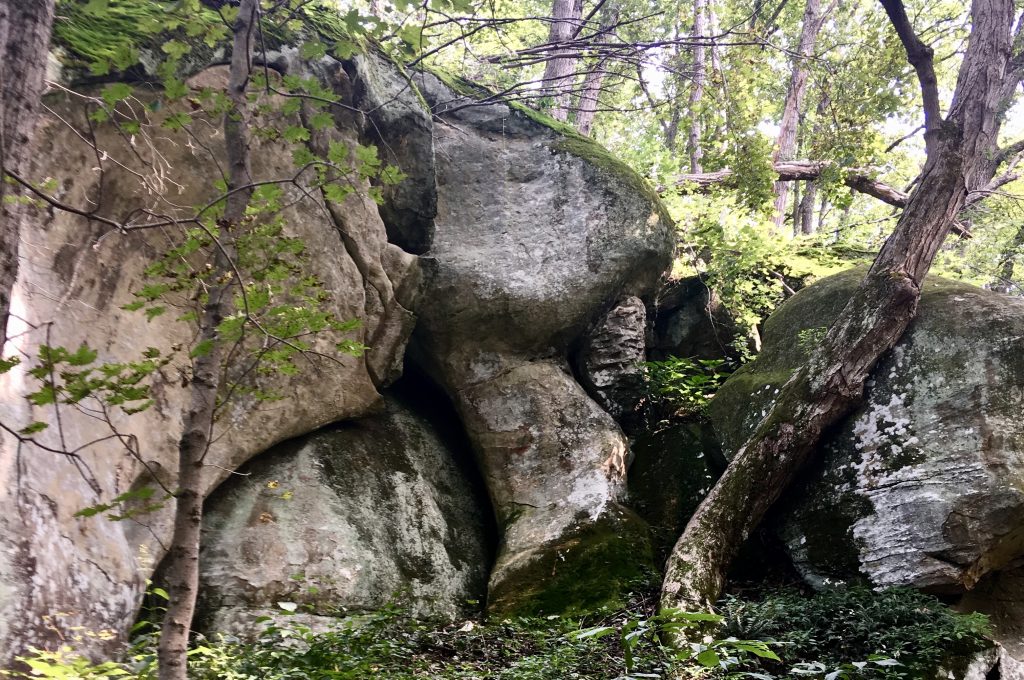 After passing a junction with Canaanville Run Trail, you will reach Canaanville Run. After you descend to the stream bed on a short, steep set of rock steps (which may be challenging for some hikers) and cross the stream, the continuation of the trail is about 30 feet downstream on the left. Shortly after crossing Canaanville Run, the trail ascends steeply with a small spring-fed pool on your right, followed by a scramble over the base of a large fallen tree (possibly difficult for some hikers). This forest in this area was devastated by powerful winds on May 26, 2019, but the damage was localized. After passing a junction with Mythical Tree Trail, there are some striking rock formations on the left. After crossing the gas line clearing again, turn right at the second junction with Mythical Tree Trail to descend to a service road (which is often muddy). Turn left there and walk about 500 feet to reach the parking lot.