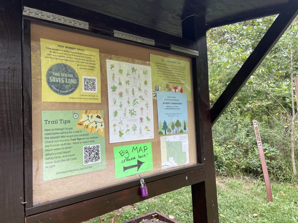 Some of the trail names may arouse curiosity. Liar’s Ridge Trail refers to the tall tales told by some members of the trail crew while building it. The Mythical Tree Trail refers to a large fallen trunk that was blocking that trail when its route was initially planned, the size of which grew to mythical proportions in the minds of those who were going to have to cut it eventually. When finally cut, it turned out to be less impressive than imagined during the months of procrastination. Four pieces cut from the trunk remain along the trail as seats for hikers (though they have become too decayed since then to be very inviting). Cockatiel Ridge refers to an incident in 2008 when an Ohio University student doing a project for a botany course saw a Cockatiel in the trees, lured it down, and caught it. Not wanting to keep it herself, she took it to a pet shop a few miles away, which it turned out was the place the bird had escaped from days earlier. The famished Australian bird, unable to feed itself in the wilds of Ohio, eagerly returned to its cage and gorged itself.