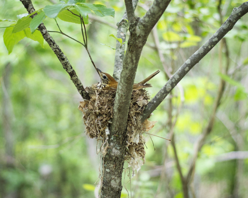 Baker Preserve is an excellent birding area from April through October. Treefall gaps in the northeastern corner of the preserve along Mythical Tree Trail and Liar’s Ridge Trail, which resulted from a 2019 windstorm, have filled in with dense shrubs and saplings, providing good nesting habitat for birds. Common breeding species in the preserve include Red-eyed Vireo, Wood Thrush, Hooded Warbler, Kentucky Warbler, Ovenbird, Louisiana Waterthrush, Acadian Flycatcher, Eastern Wood Pewee, Scarlet Tanager, and Eastern Towhee.
