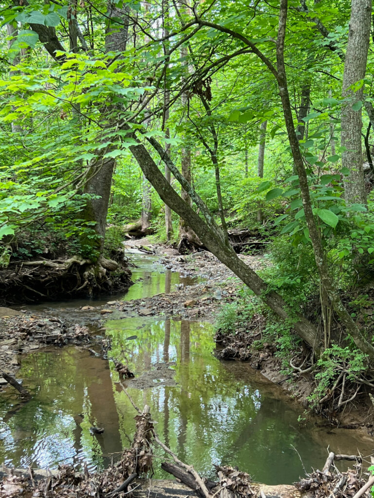 The trail includes two bridgeless crossings of Canaanville Run, so waterproof footwear is recommended. Although the stream is frequently no more than ankle-deep, it is subject to flash floods, so we don’t recommend hiking this trail during or soon after a heavy rainstorm. If in doubt, it is best to walk the trail clockwise, so that the first steam crossing is only 500 feet from the parking lot. You don’t want to walk 2.3 miles and then discover you can’t reach your car!