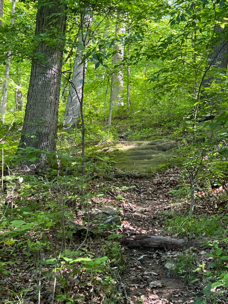 After passing a junction with Canaanville Run Trail, you will reach Canaanville Run. After you descend to the stream bed on a short, steep set of rock steps (which may be challenging for some hikers) and cross the stream, the continuation of the trail is about 30 feet downstream on the left. Shortly after crossing Canaanville Run, the trail ascends steeply with a small spring-fed pool on your right, followed by a scramble over the base of a large fallen tree (possibly difficult for some hikers). This forest in this area was devastated by powerful winds on May 26, 2019, but the damage was localized.